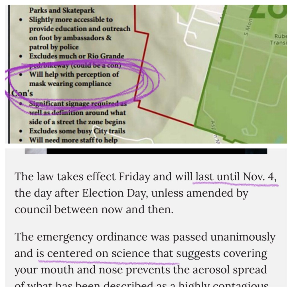If Covid-19 is like a mountain lion or a bear… well, we have more issues than I thought. It is not. And to compare it to a lurking predator is both ridiculous and reckless. Anyhow… you see here that the reasons for wearing a mask in the great outdoors are really just to help people with the “perception of compliance” rather than actually keep anyone healthy. The idea that everyone is compliant to government mandates just warms the heart doesn’t it?